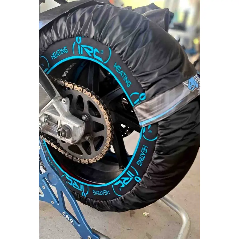 Calentador de neumáticos IRC ZasRacing 80º con thermopar y Resistencia de CARBONO , exterior en Nylon ignifugo, con bandas laterales para conservar mejor la temperatura , cable individual y LED de funcionamiento para cada calentador. utilizado por equipos de Motogp y Superbike, relación calidad-precio inmejorable.