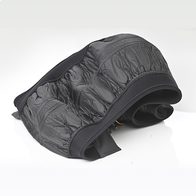 El calentador está fabricado con elementos calefactores de fibra de carbono recubiertos con silicona conductora de calor, lo que garantiza una distribución uniforme de la temperatura. El interior está compuesto de un tejido retardante de llama, mientras que el exterior está fabricado con un tejido gomaizado, resistente al fuego, al agua y al aceite, lo que asegura la durabilidad del producto en condiciones extremas de competición.