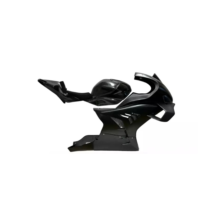 Carenado completo fabricado en fibra de vidrio y resina de poliéster para motos de competición, con refuerzos de carbono y kevlar.