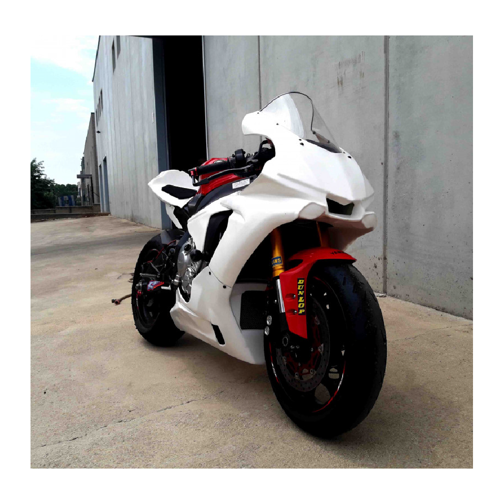 Carenado completo fabricado en fibra de vidrio y resina de poliéster para motos de competición.