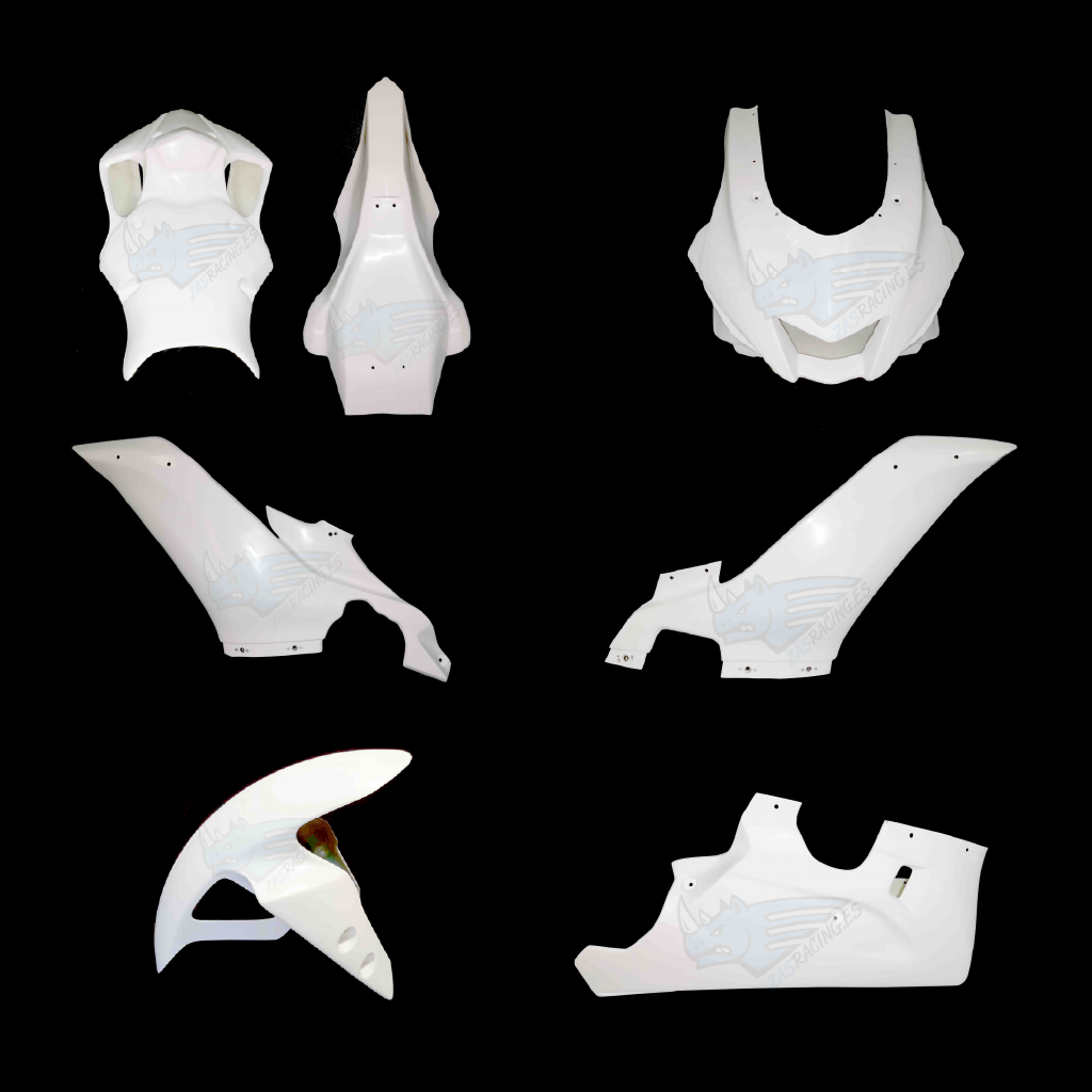 Carenado completo fabricado en fibra de vidrio y resina de poliéster para motos de competición.