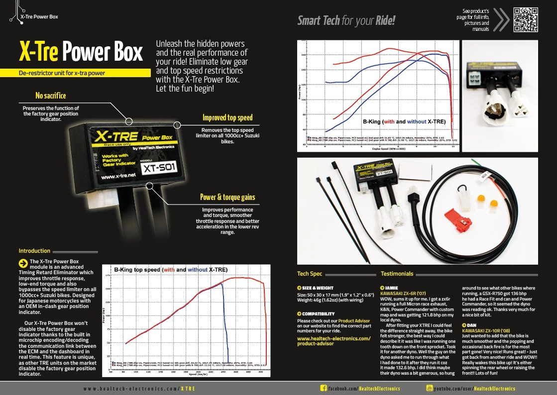 El HealTech X-TRE Power Box está diseñado para motocicletas Suzuki y Kawasaki con indicador de marcha en el cuadro de serie. Por otro lado, funciona perfectamente junto a otros dispositivos electrónicos como FI Tuner Pro, Power Commander o SpeedoHealer.