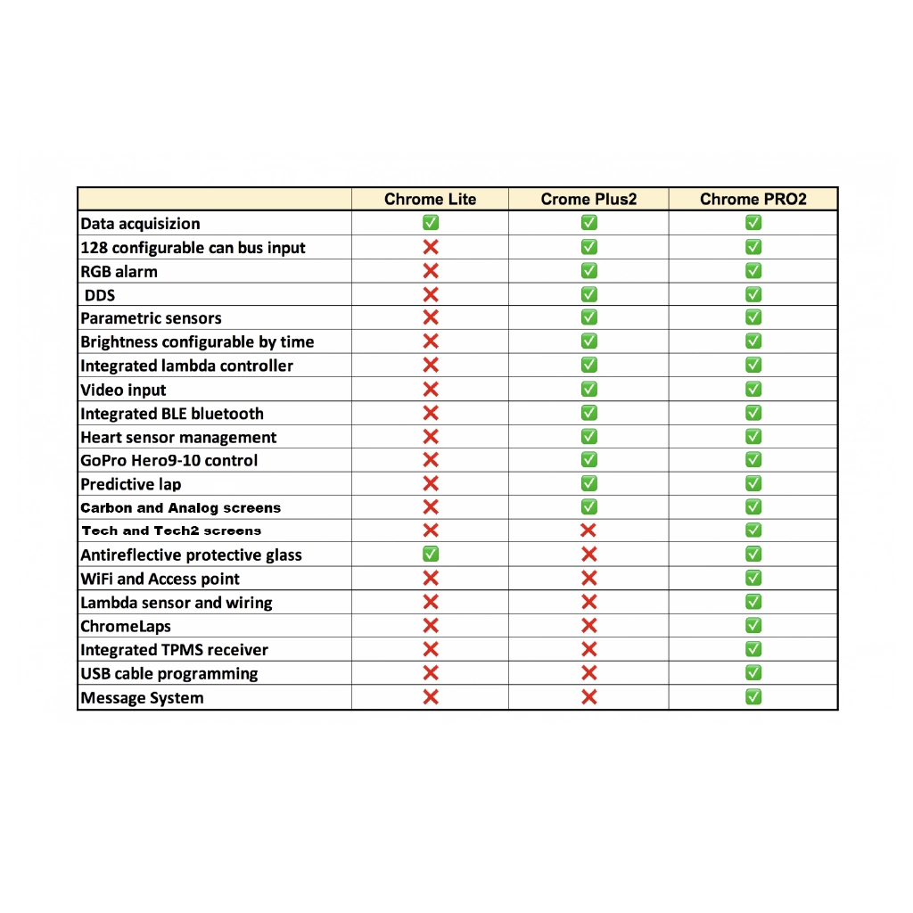 Gracias a su nuevo hardware dedicado basado en un procesador de doble núcleo, el Chrome PLUS2 puede leer y adquirir más de 128 canales Can Bus, además de los 30 canales estándar, que incluyen velocidad, RPM, entradas analógicas externas, presión y temperatura de neumáticos, GPS, marchas, agua, aceite, entre otros.