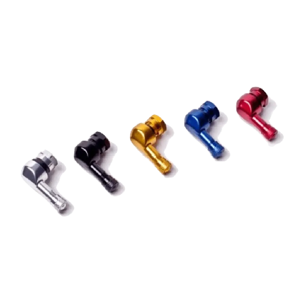 Válvulas acodadas 90º para llantas de moto, fabricadas en materiales resistentes para facilitar el inflado.